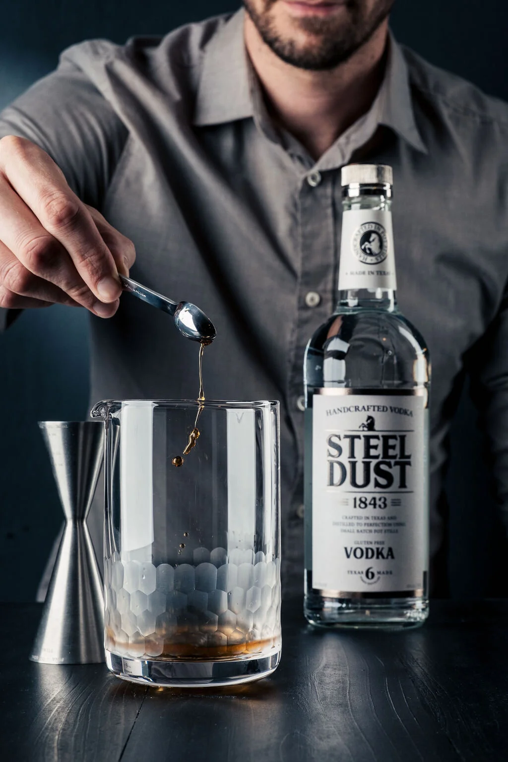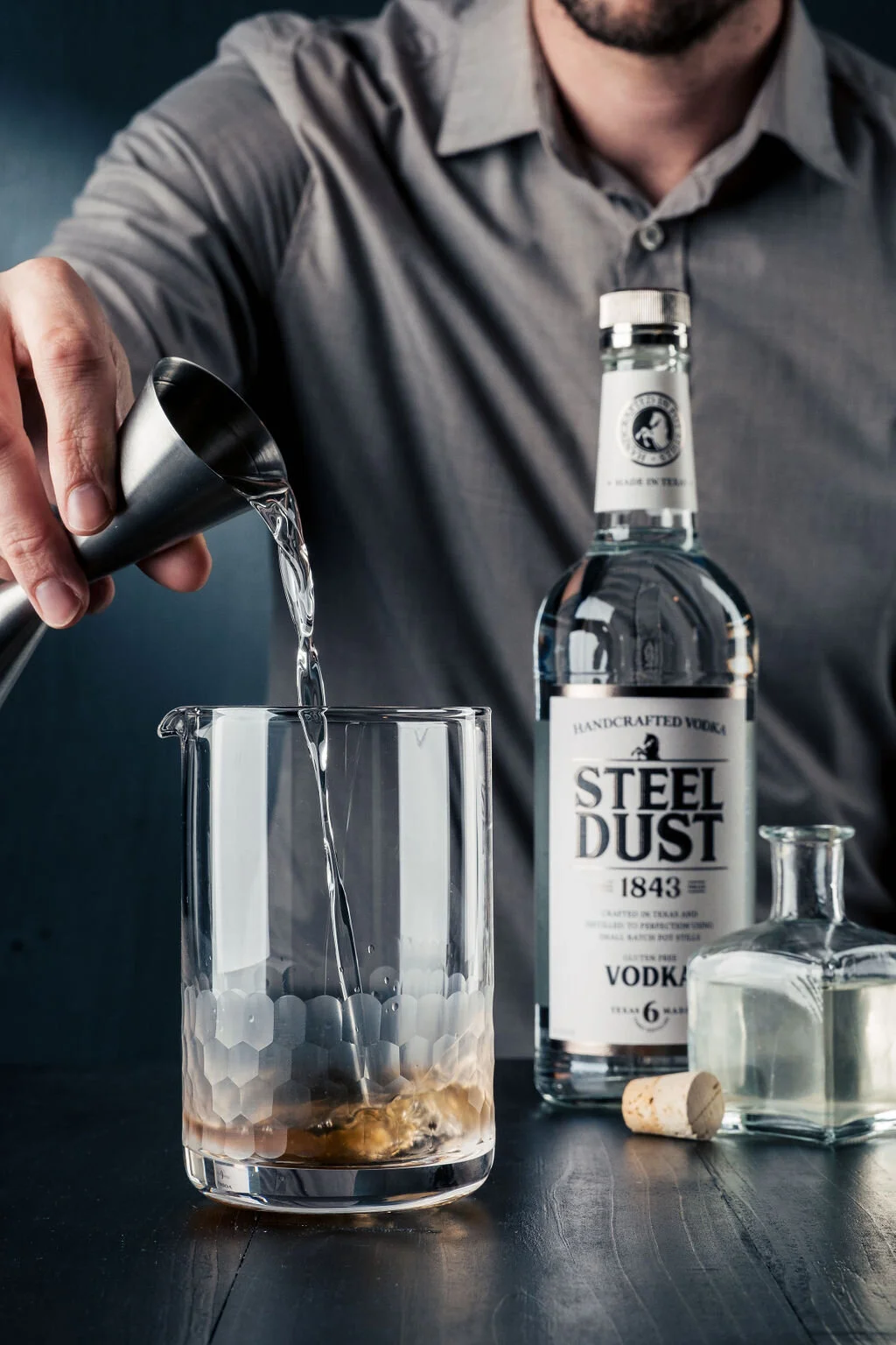 I infused Steel Dust Vodka with brown butter, which gives it a creamy texture and a subtle caramel/toffee flavor. (There are instructions for “fat washing” vodka at the end of this post.)